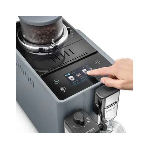 ماكينة قهوة ديلونجي ريفيليا EXAM440.55.G مع قادوسين قابلتين للتبديل بسعة 250 غرام، شاشة ملونة تعمل باللمس 3.5 إنش، تقنية LatteCrema Hot لرغوة حليب غنية، 16 مشروبًا، وتصميم أنيق وصغير الحجم مع إمكانية إعداد ما يصل إلى 4 ملفات تعريف للمستخدم.