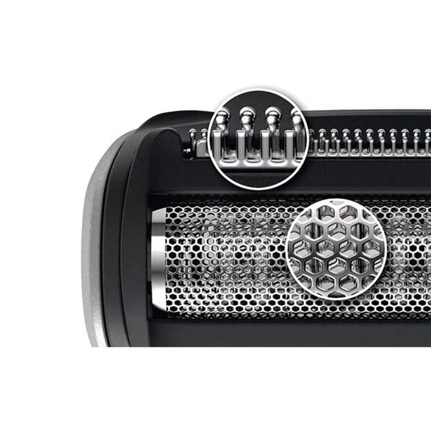 يتميّز رأس آلة الحلاقة برؤوس مستديرة حائزة براءة اختراع ورقاقة مضادة للحساسية لحماية بشرتك أثناء الحلاقة. وتقص أدوات التشذيب الثنائية الاتجاه الشعيرات الطويلة التي تتم حلاقتها بالرقاقة المعدنية، للاستمتاع بحلاقة أدق.
