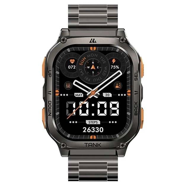 تم تصنيع الساعة بجسم معدني مغلق بالكامل، مما يمنحها صلابة استثنائية لتحمل أقسى الظروف. كما أنها مجهزة بمعالج Actions ATS3085L ثنائي النواة، مما يضمن أداءً سلسًا واستهلاكًا منخفضًا للطاقة.