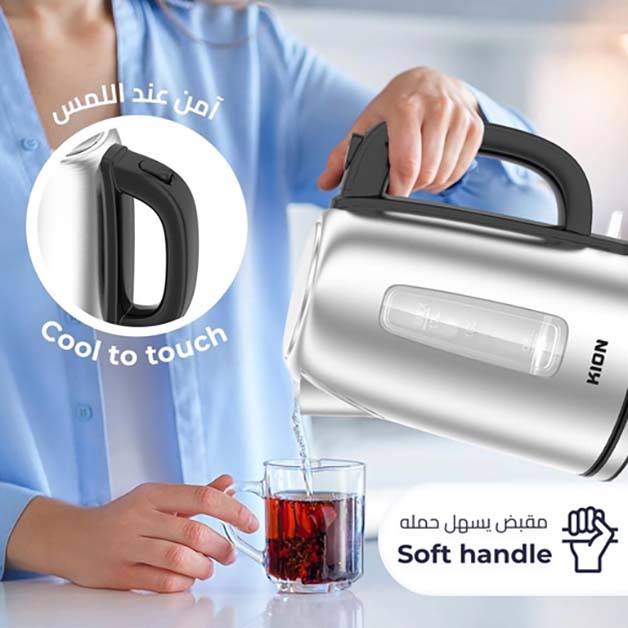 استمتع بغلي الماء بسهولة وأمان مع غلاية كيون الكهربائية بسعة 1.7 لتر وقوة تصل إلى 2200 واط، المصممة لتوفير تجربة يومية مريحة وسريعة: