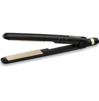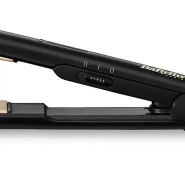 مكواة شعر BaByliss بدرجة حرارة قصوى تصل إلى 230 درجة مئوية وعرض 25 مم، باللون الأسود مع لمسات ذهبية. هذه المكواة مثالية لتنفيذ تسريحات شعر فريدة وجميلة بسهولة في المنزل. لكنها ليست مثالية لإنشاء تموجات ناعمة وطبيعية أو لتصفيف الشعر أملس ومستقيم.
