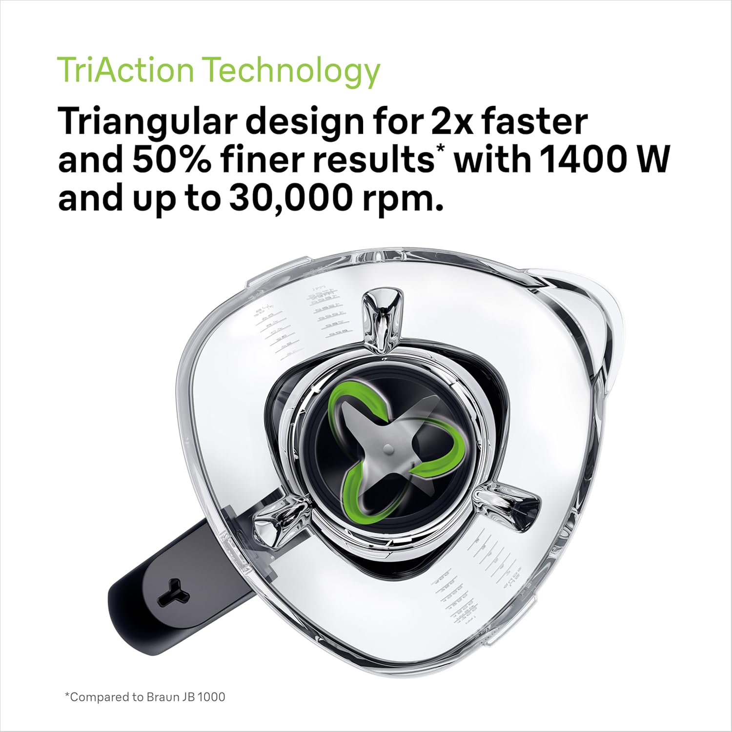 - تقنية ثلاثية المفعول: تمزج جميع أنواع الطعام، بفضل الإبريق الثلاثي، لا توجد بقع عمياء ويتم إرجاع المكونات بشكل أسرع إلى منطقة الخلط.