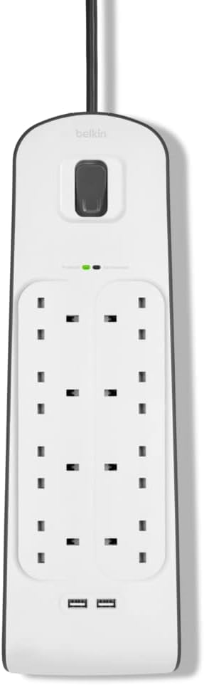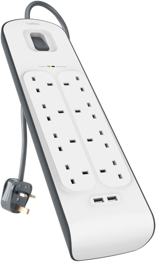 وصلة تمديد كهربائية للحماية من اندفاع التيار بـ 8 منافذ/8 اتجاهات وسلك 2 متر من بيلكن، مقبس تمديد شديد التحمل بمدخلين USB مشتركين 2.4 امبير
