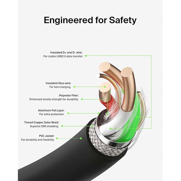 - تم اختباره ليتحمل الانثناء لأكثر من 8000 مرة*، معتمد من ام اف اي من ابل لتشغيل آمن وموثوق مع أجهزة اي او اس، محمي بضمان لمدة عامين