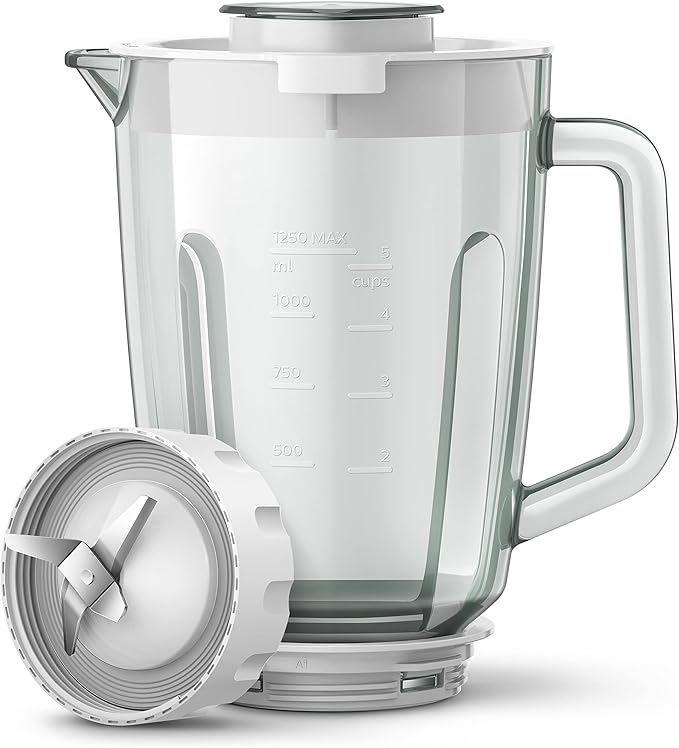 يأتي الخلاط بوعاء زجاجي بسعة فعالة 1.25 لتر، ما يكفي لتحضير حتى 5 مشروبات دفعة واحدة، مع تصميم مريح ومتوافق مع جميع المطابخ، وقاعدة شفط مضادة للاهتزاز لتوفير الاستقرار أثناء الاستخدام. يحتوي الخلاط على مستشعر MTP لحماية المحرك من ارتفاع الحرارة، وملحق مفرمة لمعالجة مكونات مثل البصل والثوم والفلفل واللحم.