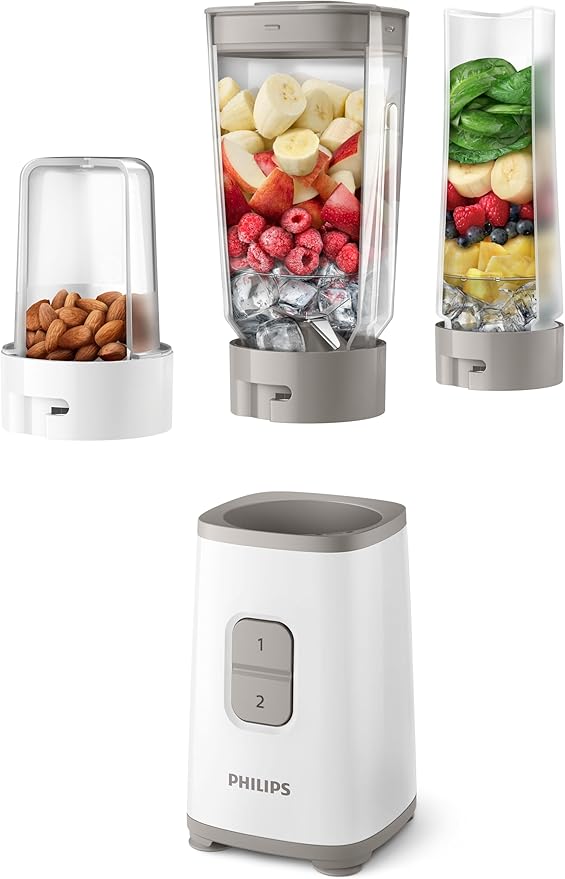 محضرة الطعام متعددة الوظائف من فيليبس بقدرة 350 واط توفر خلطًا سريعًا وفعالًا لمكوناتك المفضلة في حوالي 30 ثانية فقط باستخدام الشفرة النجمية الرباعية. يمكنها تحضير مشروبات الفاكهة الصحية، سحق الثلج، وخلط المكونات القاسية مثل الكيوي والمكعبات الثلجية بسهولة.