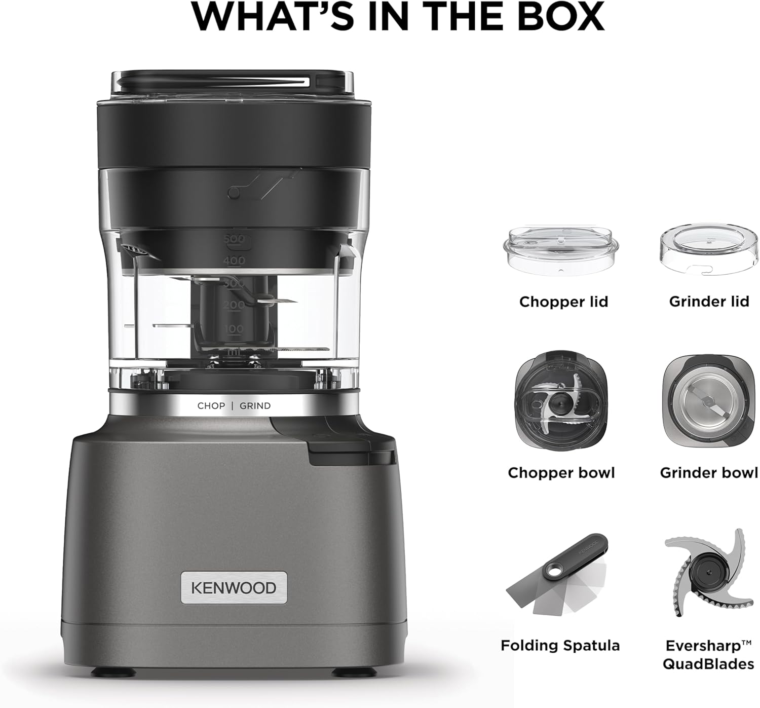كينوود قطاعة ومطحنة طعام 2 في 1 ديو بريب واط، شفرات رباعية مسننة مطحنة صغيرة عالية السرعة