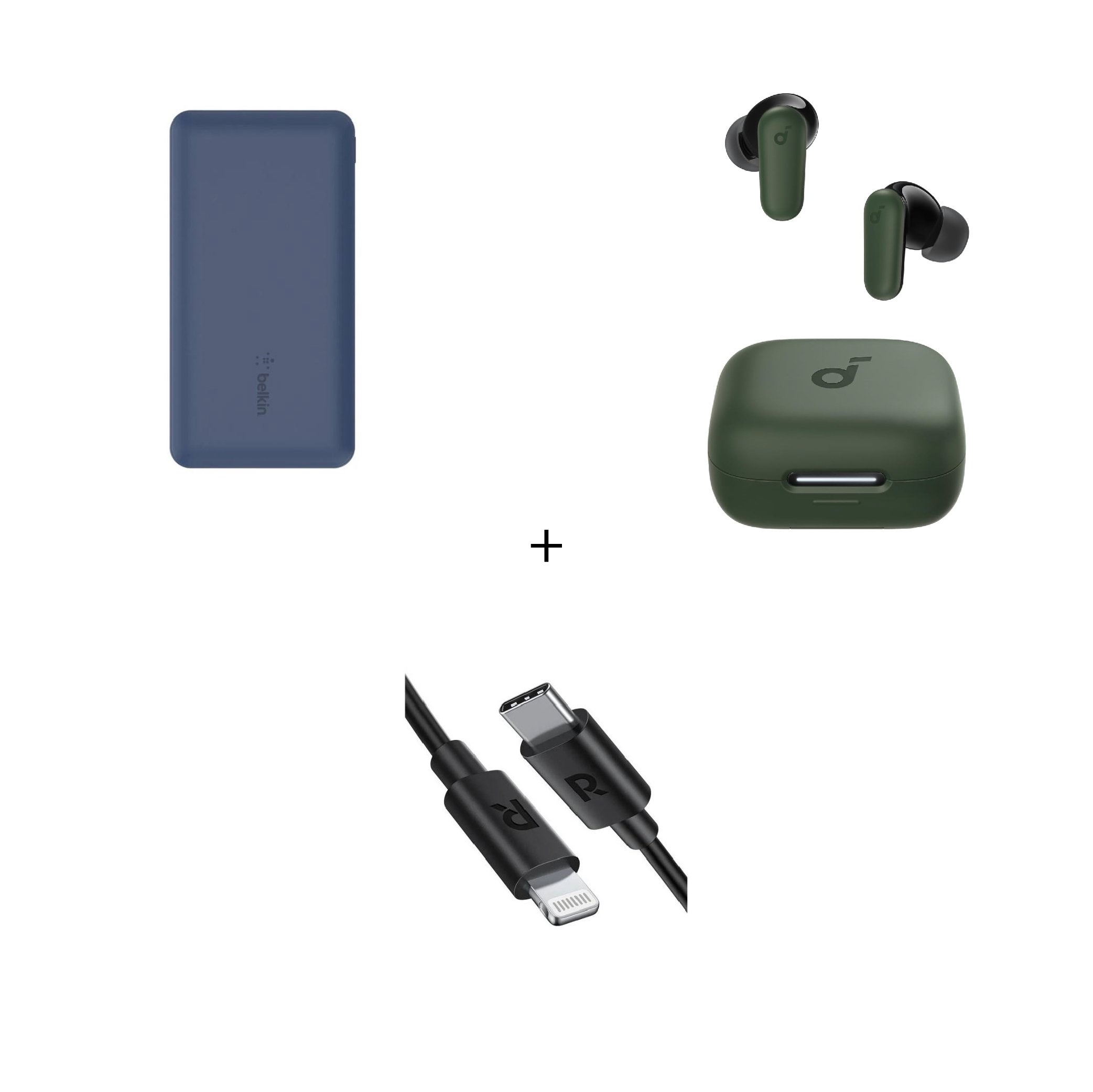 Belkin 10,000mAh Power Bank – Blue+RAVPower Type-C to Lightning Cable – 2 Meters – Black+Soundcore P30i Wireless Earbuds – Black