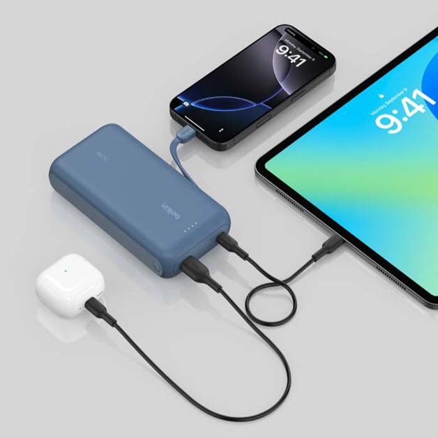 With its built-in USB-C cable, USB-A port, and USB-C port, you can charge three devices at once with a total shared output of 30W. Enjoy charging your phone and tablet anytime, anywhere.