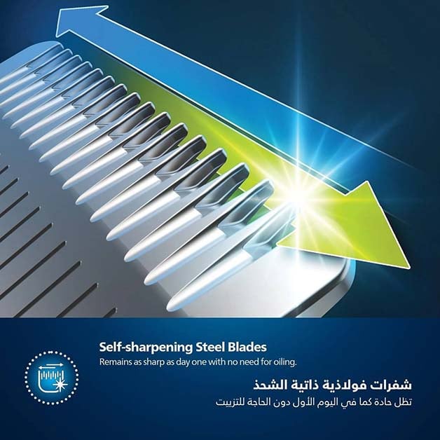 All-in-one personal care device with 13 tools for trimming and styling beard, hair, and body. Features self-sharpening stainless steel blades and BeardSense technology to adjust power based on beard density, plus a precision comb with 19 length settings (0.5–16 mm). Offers up to 4 weeks of use on a single charge, water-resistant for easy use and cleaning, with a lithium-ion battery, fast charging, and an ergonomic design for optimal control.
