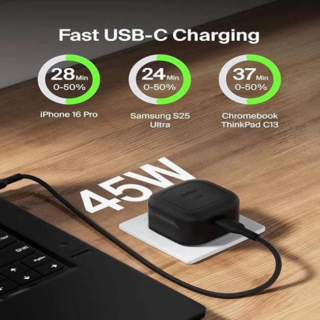 Belkin BoostCharge 45W Wall Charger delivers fast and safe charging for iPhone and Samsung devices with USB PD 3.1 technology, powering up to 50% in just 30 minutes. Features a compact and durable design with a 1m USB-C cable and SmartProtect for overcharge protection. Made from sustainable materials with plastic-free packaging and backed by a 2-year warranty.